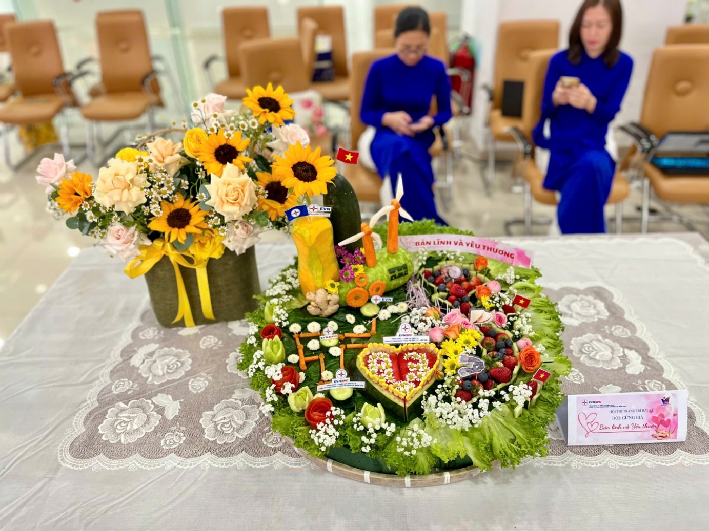 Sôi nổi và rộn rã tiếng cười nhất là Hội thi Trang trí rau củ với 04 đội, mỗi đội 07 nữ và 03 nam CBCNV, điểm mới ở đây là thể hiện tinh thần sát cánh, đồng hành của anh em nam trong các hoạt động đơn vị. Sự phân công thật ăn ý: các chị em là "đạo diễn" lên ý tưởng, chỉ đạo sáng tạo; các anh em là những“diễn viên” giúp truyền tải ý tưởng, thông điệp sản phẩm, tự tay cắt tỉa tỉ mỉ từng chi tiết với sự hăng hái, tập trung cao độ.