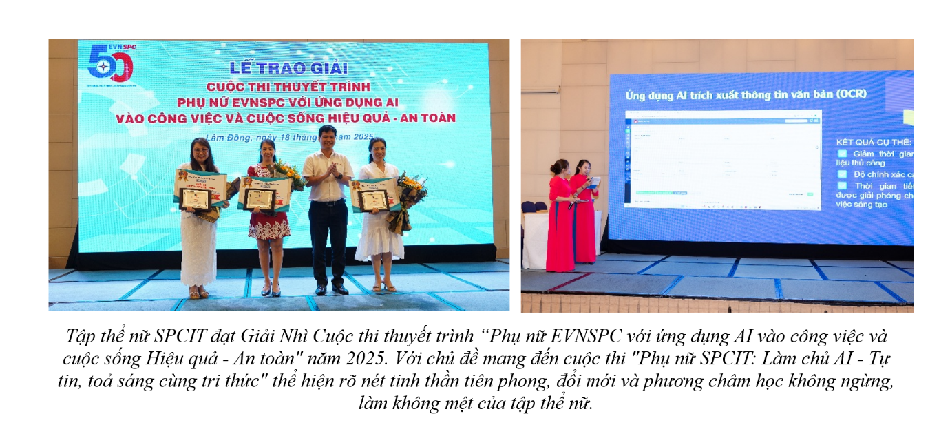 Tập thể nữ SPCIT đạt Giải Nhì Cuộc thi ảnh “Phụ Nữ EVNSPC giữ gìn Văn hóa Doanh Nghiệp” năm 2025 - trong sắc xanh áo dài, đội hình vững chắc vươn cao biểu tượng của đoàn kết, niềm tự hào dân tộc và tinh thần trách nhiệm nghề nghiệp. Qua đó lan toả hình ảnh phụ nữ ngành điện hiện đại trong hành trình chuyển đổi số.